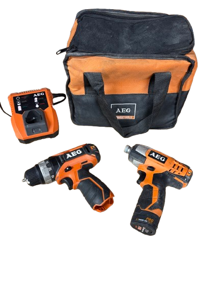 AEG slagskrutrekker, en AEG BSS 12C. AEG BS 12C2 Drill Begge verktøyene er en del av AEG Powertools 12V-serien. De har et kompakt design med oransje og svart fargevalg. Kommer med veske ,1 stk batteri 1,5 Ah og lader.