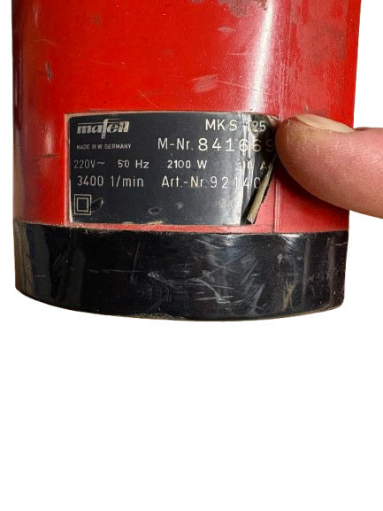 Produsert i Vest-Tyskland (W. Germany) Spenning: 220V~ Frekvens: 50 Hz Effekt: 2100 W Hastighet: 3400 1/min (omdreininger per minutt) Skjærer 125 Mm dypt