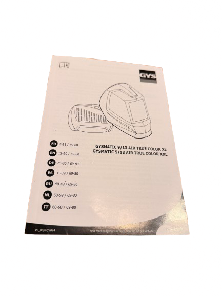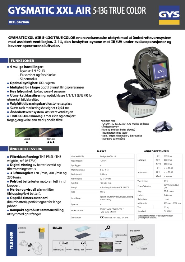 GYSMATIC 5/13 AIR XXL er en sveisehjelm med lufttilførsel. 2 i 1 beskytter den brukerens øyne mot IR / UV og brukerens åndedrettssystem under sveiseoperasjoner.